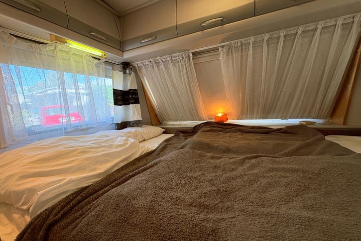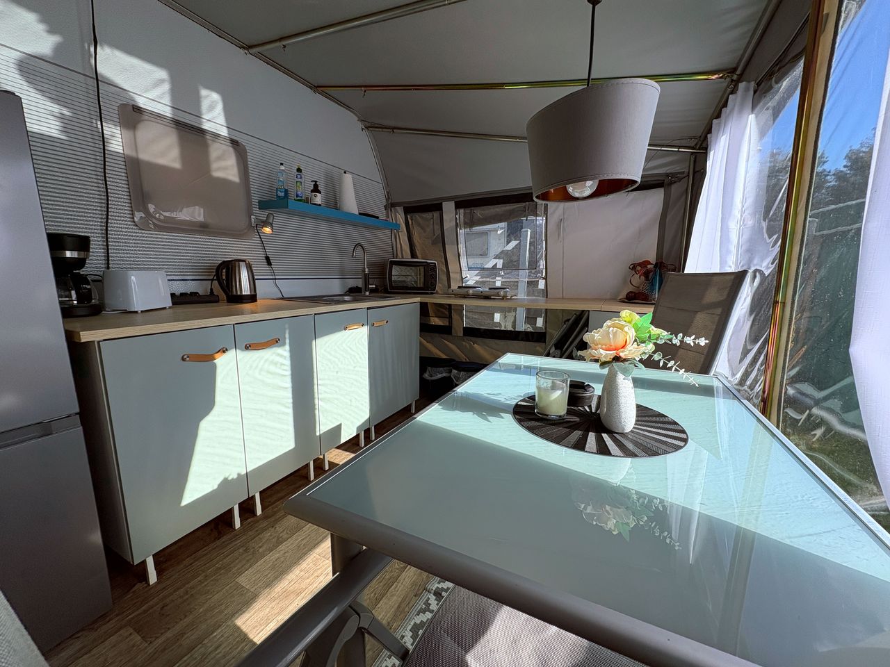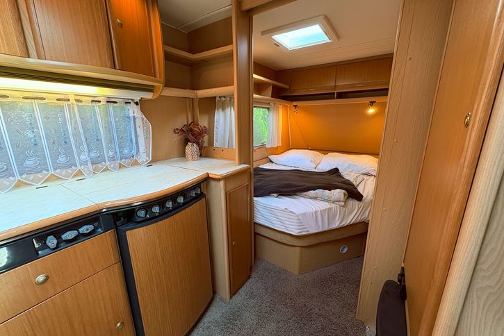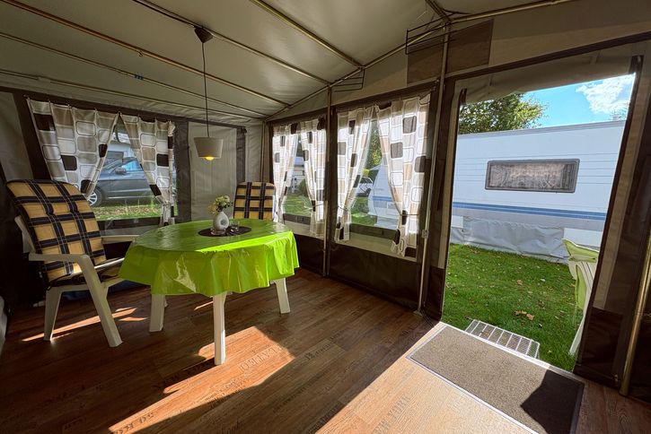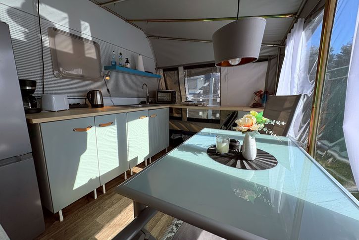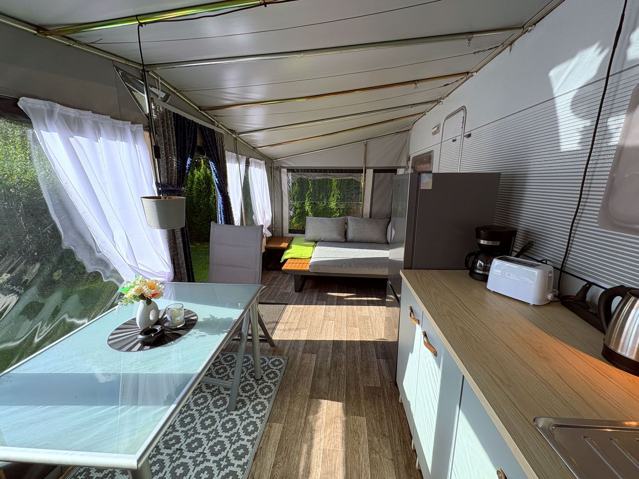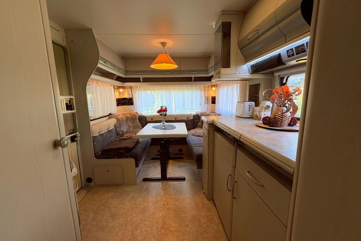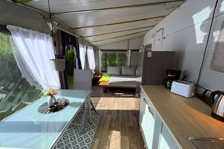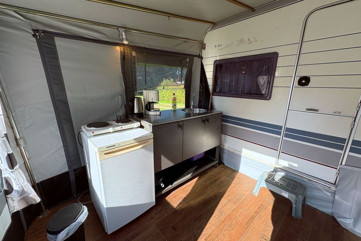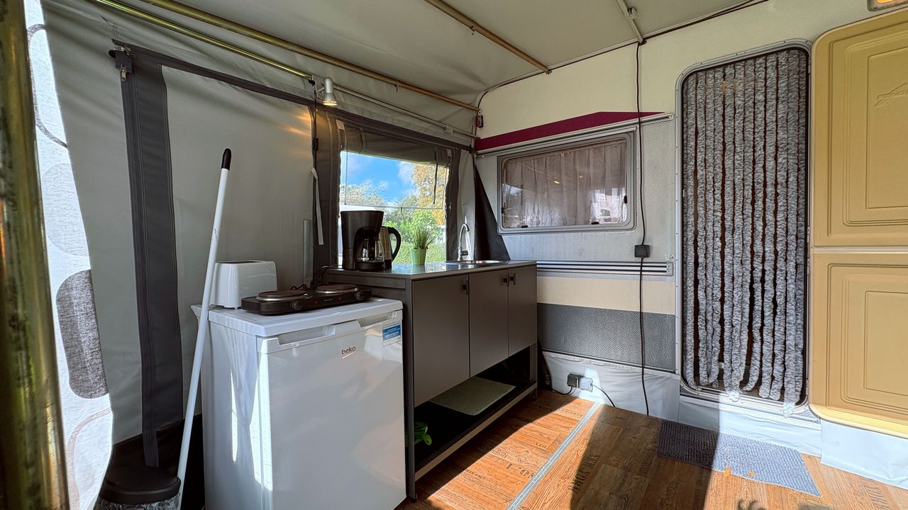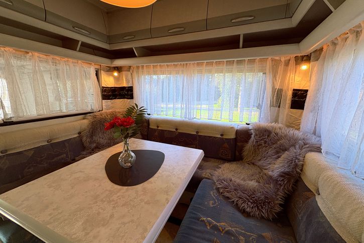 Unsere Mietwohnwagen sind einfach und funktional ausgestattet, damit Sie sich rundum wohlfühlen. Jeder unserer Mietwohnwagen (1–4) verfügt über eine grundlegende Ausstattung, die Ihren Aufenthalt angenehm gestaltet. Zur Ausstattung gehören ein Fernseher, eine Kaffeemaschine, ein Wasserkocher, ein Kühlschrank, Kochplatten, ein Toaster sowie Geschirr, Besteck und verschiedene Kochutensilien.